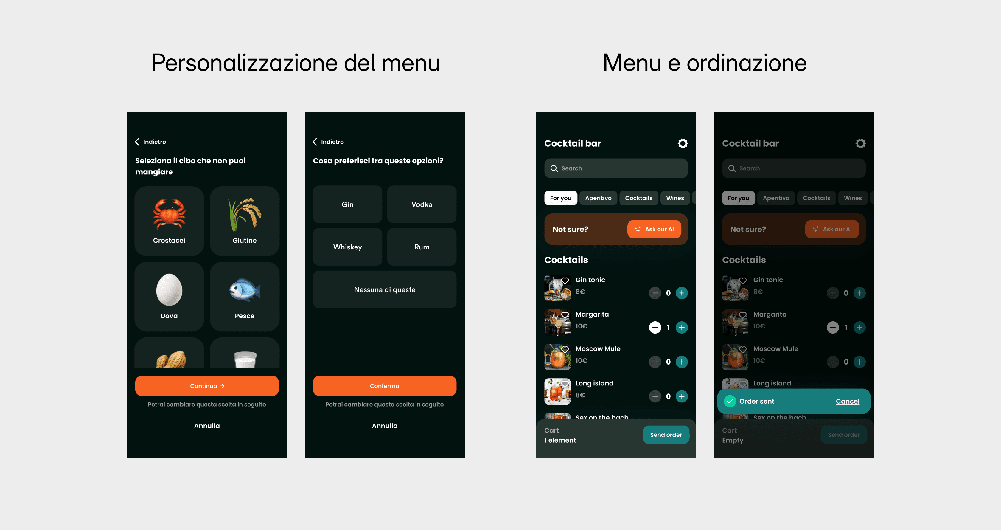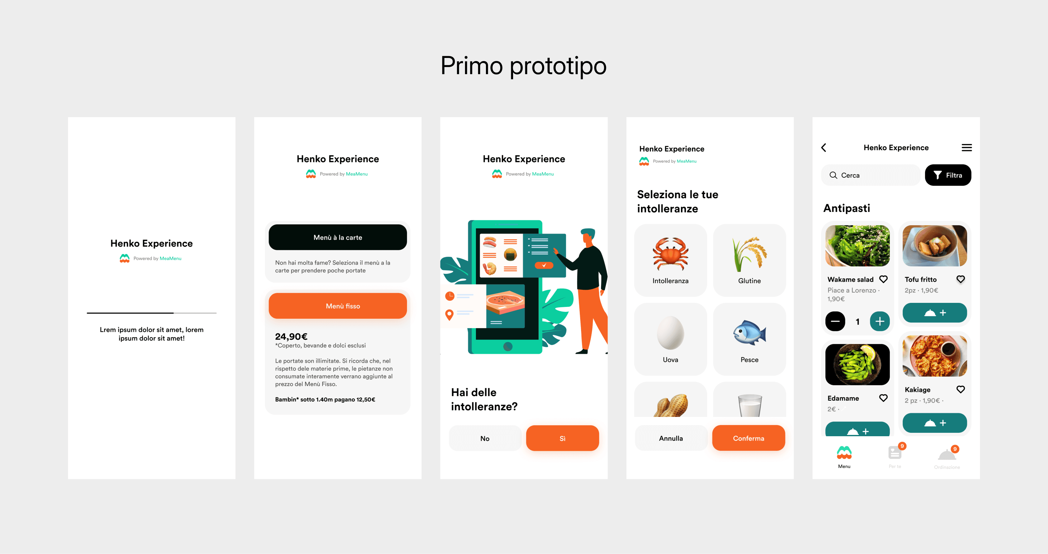 Il primo flusso era molto semplice e grezzo, ma bastava per andare a testare l’idea con gli utenti reali: selezione del menu, questionario sulle intolleranze, e ordinazione.