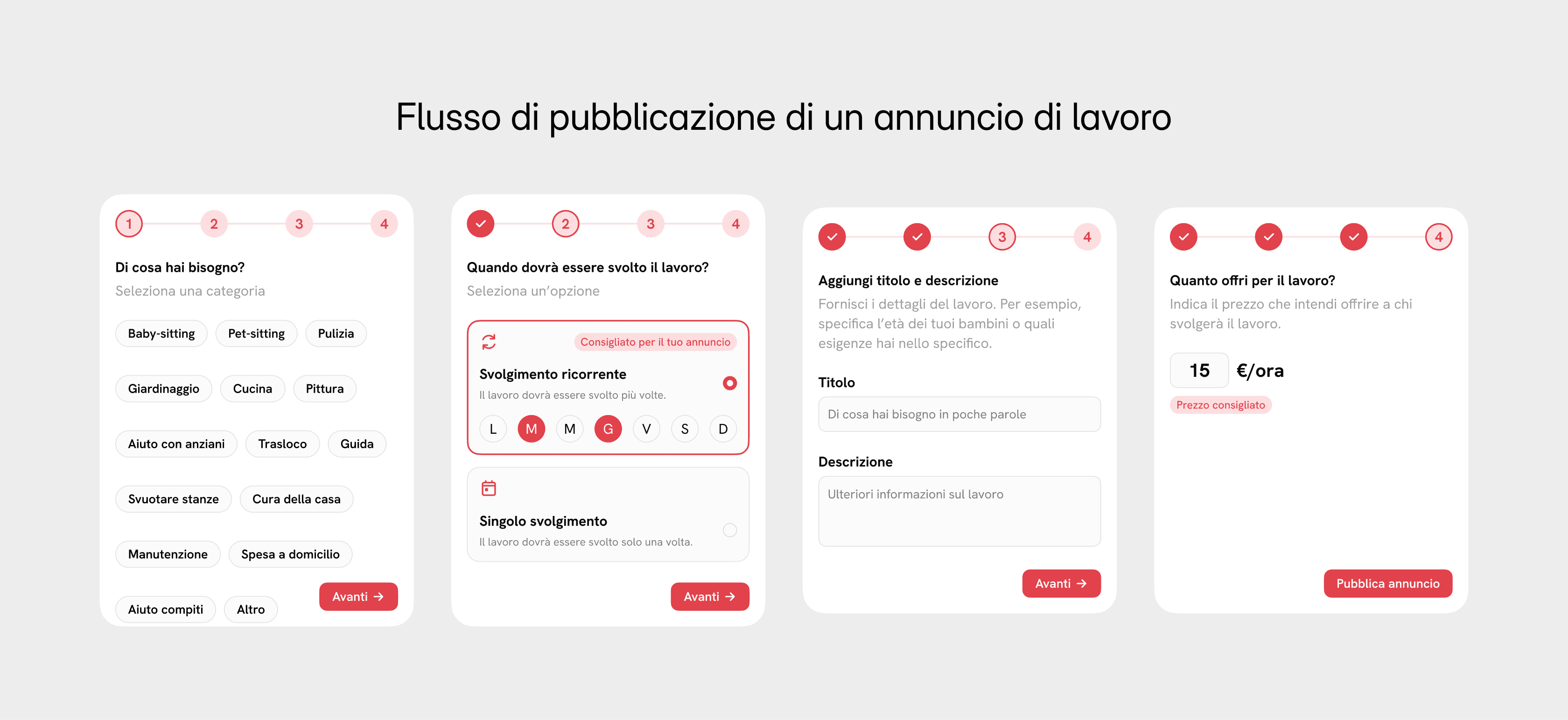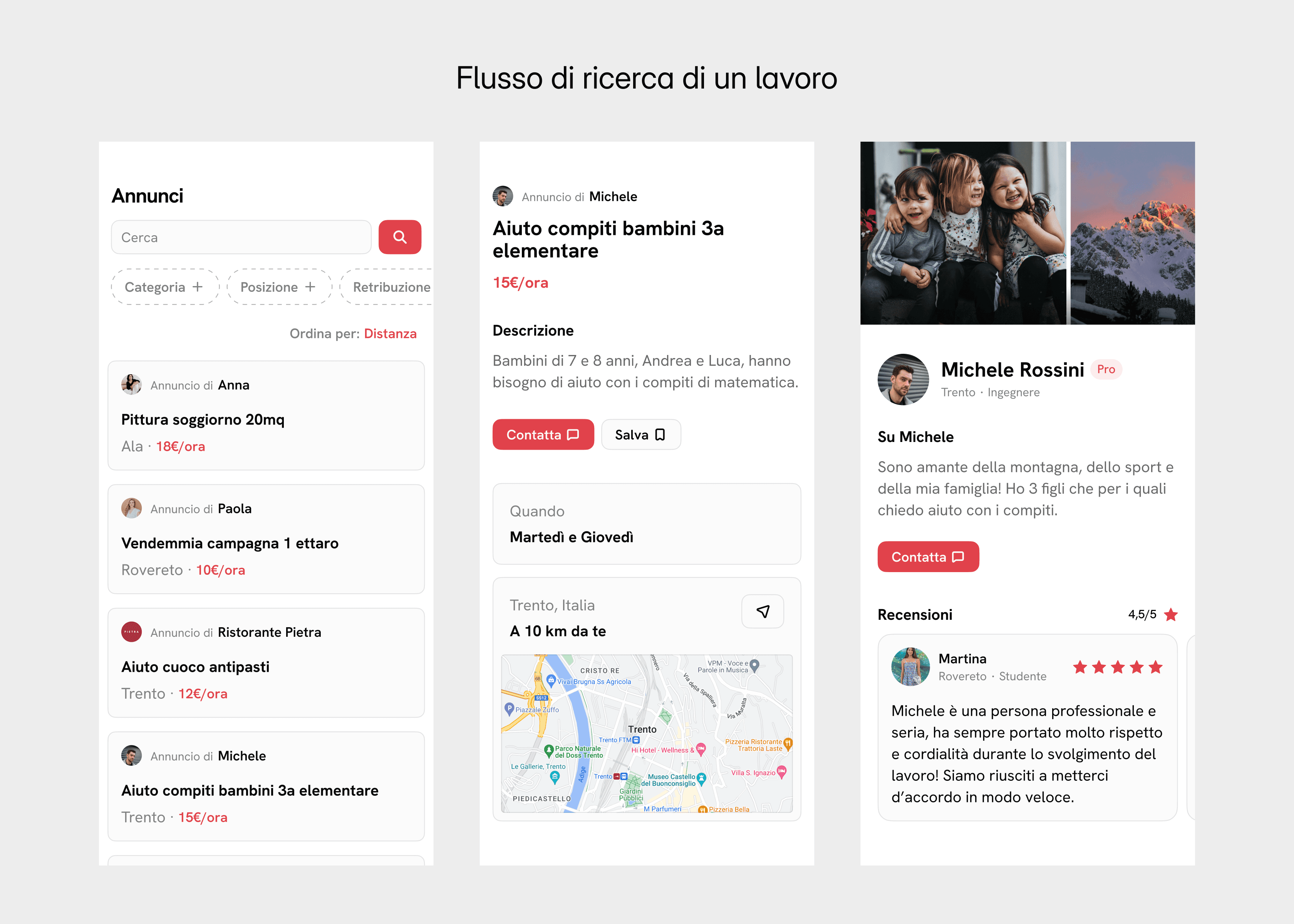 I primi schizzi si sono evoluti in prototipi di alta fedeltà. L'obiettivo era quello di garantire una navigazione intuitiva sia per chi cerca lavoro che per chi lo offre. Le caratteristiche principali includevano un sistema di pubblicazione semplice per chi offre lavoro e delle funzionalità di ricerca per consentire a chi cerca lavoro di trovare facilmente le posizioni adatte a loro.