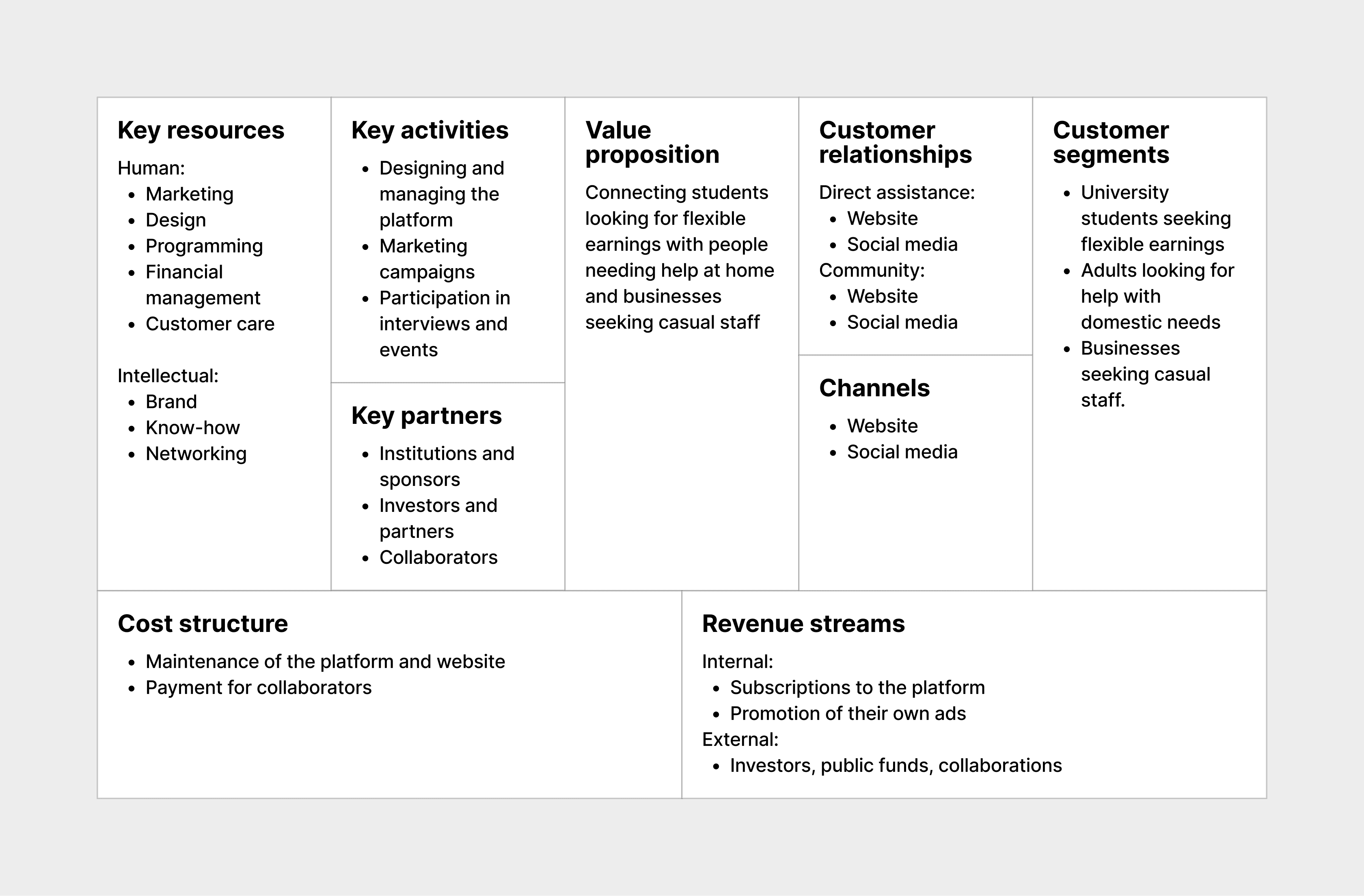 Oltre alla parte di UX, ho tenuto conto anche degli aspetti di business, creando un Business Model Canvas che delineasse la proposta di valore, le attività chiave, i segmenti di clientela e i flussi di cassa.